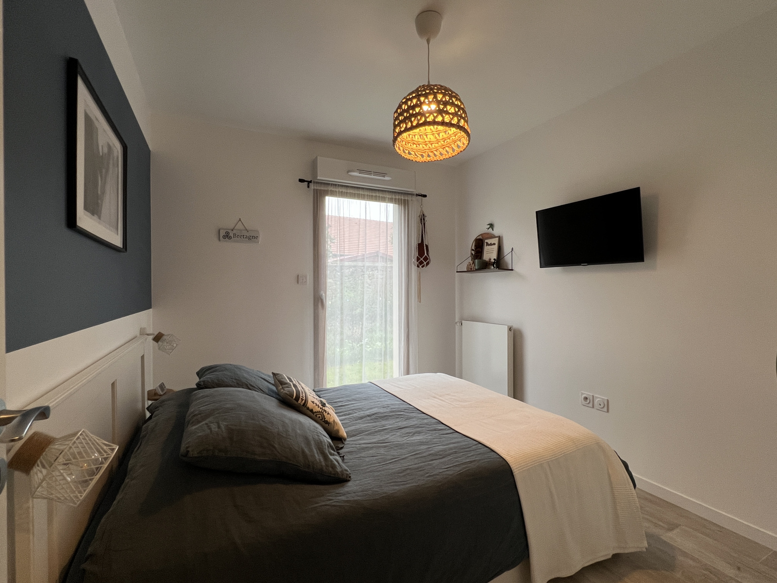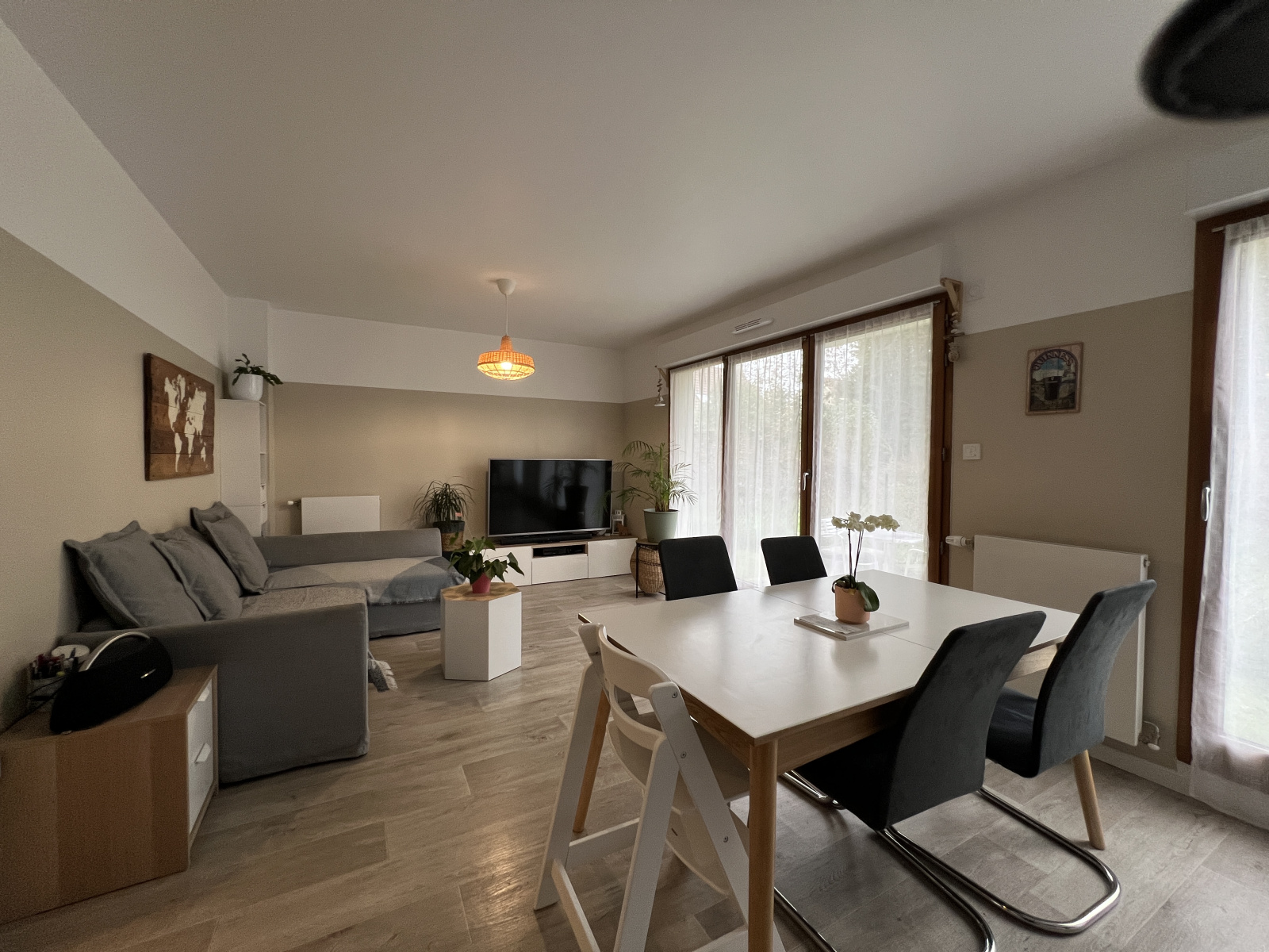 Il comprend : entrée sur couloir desservant deux chambres, cuisine aménagée et équipée ouverte sur séjour, cellier, salle d'eau et WC.